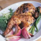 Remove the chicken from the marinade, wiping off any excess, and place it, skin side down, on the grill. Center a grill press on top of the chicken to hold it flat. Grill the chicken, removing the press occasionally and turning the chicken over so it does not burn, until the juices run clear when a thigh is pierced with a knife and an instant-read thermometer inserted into the thickest part of the thigh, away from the bone, registers 170°F, about 30 minutes; if necessary, move the chicken to a cooler part of the grill to prevent it from burning. Transfer the chicken to a cutting board and let rest for 5 minutes before carving. Serve hot or at room temperature.