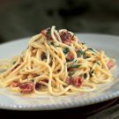 Drain the pasta, leaving a bit of water clinging to it, and add it to the bowl with the eggs and cheeses. Toss quickly (this will heat the eggs and leave a creamy coating on each strand of pasta). Add the pancetta with all of the pan juices. Season with salt and a generous amount of pepper. Add the parsley and toss again. Serve immediately. Makes 4 main-course or 6 first-course servings.