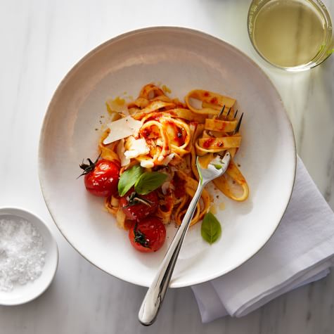 While the pasta is cooking, cut some of the cherry tomatoes in half; reserve a few whole tomatoes for garnish. Pour the pasta sauce into a 4-quart (4-l) sauté pan, set over medium-high heat and bring to a simmer. Add the drained pasta and halved tomatoes. Stir until the pasta is coated with the sauce and warmed through. Transfer to a bowl.