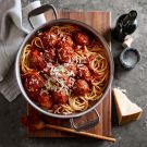 Meanwhile, bring a large pot of salted water to a boil over high heat. About 10 minutes before the meatballs are done, add the pasta to the boiling water and cook until al dente (tender but firm to the bite), according to the package instructions. Drain and add the pasta to the pan with the meatballs. Using tongs, gently toss to combine.