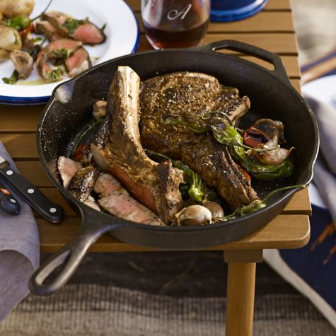 Heat a large cast-iron fry pan over a campfire, hot grill, or stove set to medium-high heat until it is very hot, about 3 minutes. Add the steaks to the pan and cook, turning once, until well seared and cooked to medium-rare, 4 to 5 minutes per side, or until cooked to your liking.