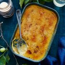 Pour the mixture into a 9-by-12-inch (23-by-30-cm) baking dish and place it in a larger pan, such as a roasting pan. Add enough boiling water to the larger pan so that it comes halfway up the sides of the smaller baking dish. Cover the pans loosely with aluminum foil and bake until the custard is just set, about 30 minutes.