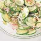 A sprinkle of toasted peanuts and bright cilantro contributes an intriguing dimension to this Thai-style salad, which is refreshing, pungent and spicy at the same time. Marinating the cucumber, onion and chili in the sweetened vinegar mixture mellows their distinctive flavors and softens their textures.