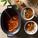 Remove the chicken thighs from the insert. Let cool slightly, then, using two forks, shred the chicken into bite-size pieces and return to the slow cooker. Stir in the shrimp and continue cooking until the shrimp are opaque and cooked through, 2 to 3 minutes. Taste and adjust the seasoning with salt and pepper if necessary.