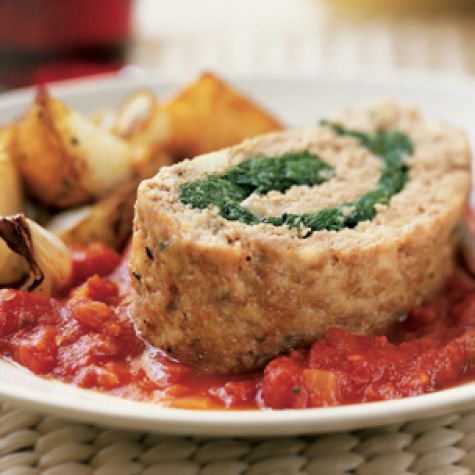 This rolled turkey meat loaf is a clever way of coaxing any meat-and-potatoes eater into enjoying vegetables, in this case, spinach and tomatoes. It makes a great dish for potlucks and buffet dinners. Accompany with Yukon Gold mashed potatoes.