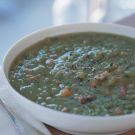 Transfer the ham hock to a platter or cutting board and let cool until it can be handled, about 15 minutes. Using your fingers or a knife and fork, remove the meat from the bone, shredding or cutting the meat into bite-size pieces. Stir the meat back into the soup along with the parsley. Ladle the soup into warmed bowls and serve immediately. Serves 6 to 8.