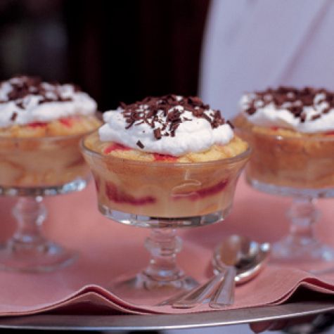 To assemble, using a serrated knife, cut the cake into slices about 2-by-3 inches and 1⁄4 inch thick. Line the bottom of four 1-cup bowls, preferably clear glass, with some of the cake slices. Sprinkle the cake with some of the rum. Spread one-fourth of the custard (about 1⁄2 cup) over the cake slices. Top with another layer of cake slices, and sprinkle with 2 tablespoons of the alchermes. Spread one-third of the remaining custard over the top. Repeat to make 2 more layers of cake, liqueur, and custard, and then end with a cake layer. Cover and refrigerate for several hours, or preferably overnight, before serving.