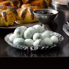 When the eggs have cooled, peel the shell from each egg. Arrange the peeled eggs on a platter and serve with the sea salt alongside. Serves 12.