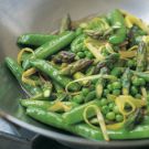 Warm a wok or large fry pan over high heat until very hot and add 1 Tbs. of the corn oil. Add the leek and ginger and stir-fry until the leek is tender, about 2 minutes. Add the remaining 1 Tbs. corn oil, the asparagus, sugar snap peas and peas and stir-fry until heated through, about 2 minutes. Add the sauce and stir until it thickens, about 1 minute. Serve immediately with steamed rice. Serves 4.