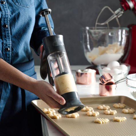 Using a cookie press allows bakers to produce a big batch of pretty cookies in a flash. Just fill the barrel with dough and pull the lever or push the plunger, depending on the type of press you own. The dough is easily pressed through a decorative disc onto a baking sheet, ready to pop in the oven.