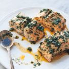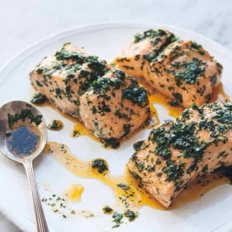Chermoula is a cilantro- and parsley-based pesto, Moroccan style. Here, it adds fresh and tangy flavors that steam along with the salmon. Leftover sauce is delicious mixed with pasta or roasted vegetables. To round out the meal, serve the salmon with a side of quinoa or roasted potatoes.