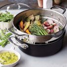 Place the potatoes and artichokes in the steamer basket. Cover the pot and steam the vegetables for 5 minutes, then add the asparagus and carrots, arranging them on top of the potatoes and artichokes. Cover the pot and continue steaming until the potatoes and artichokes are tender and the asparagus and carrots are crisp-tender, 10 to 12 minutes more.