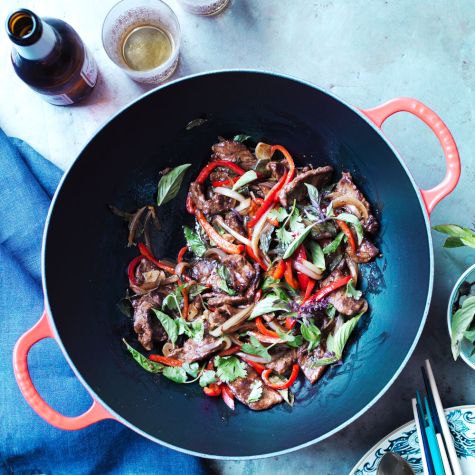 Dinner is ready in a flash with this colorful stir-fry, which combines thinly sliced flank steak with bell peppers and fresh basil. Because everything cooks quickly, be sure to have all the ingredients prepped and ready to go before you turn on the stove. Serve over steamed rice.