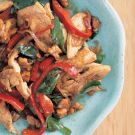 In a wok over high heat, warm 1/2 Tbs. of the oil. Add the bell pepper and cook until just soft, 1 to 2 minutes. Transfer to a plate. Warm the remaining 1/2 Tbs. oil in the wok, add the shallots and cook, stirring constantly, until they begin to brown, 30 seconds to 1 minute. Add the chicken and cook, stirring frequently, until opaque, 3 to 4 minutes.