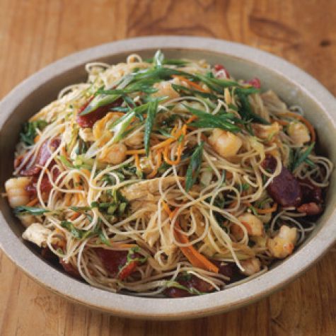 Stir-fried noodles are second in popularity to rice in the Philippines. Eaten as part of a meal or as a snack, this classic noodle stir-fry has seemingly endless variations. Here, a small amount of mildly sweet cured pork sausage, a specialty of southern China, where it is known as lop cheong, creates a chewy, smoky foundation for fine pieces of chicken and shrimp. Look for it in Chinese and other Asian markets. Substitute Chinese barbecued pork or shredded roast chicken if Chinese sausage is unavailable. The vegetables are shredded or thinly sliced to match the delicate structure of the noodles.