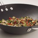 In a wok over high heat, warm the sesame oil. When hot, add the bok choy and stir-fry for 15 seconds. Add the garlic and ginger and stir-fry for 15 seconds. Stir in the bell pepper, poblano chili, bean sprouts and scallions, then stir in the wild rice. Add the hoisin sauce, cilantro and lime juice and stir to mix. Serve immediately.