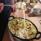 Chef Tyler Florence’s goal when developing this recipe was to create a cheesy, stretchy macaroni and cheese that also didn’t need to be baked for a long time. He decided to use Muenster, since it won the cheese stretch test in his kitchen. But after testing multiple versions, he learned that to make a really stretchy, cheesy mac and cheese, you want to fold cubes of cheese into the pasta—instead of grating the cheese into the sauce—then flash broil it just to melt the cheese and crisp the bread crumbs. The result is a supremely satisfying mac and cheese.