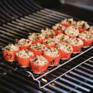Remove the rack from the grill, turn the tomatoes over and stuff each half with about 1 Tbs. of the bacon-mushroom mixture. Place the rack over indirect heat, cover the grill, and cook until the tomatoes are tender and the stuffing is golden and crisp on top, about 15 minutes. Let cool for 5 minutes before serving. Makes 18 stuffed tomatoes.