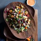 Add the vinaigrette to the vegetables and toss to coat. Add the toasted bread and toss again. Season with salt and pepper and drizzle with olive oil. Arrange the vegetables on a serving platter. Top with the shaved raw beet, olives and herb leaves. Top the salad with dollops of fresh ricotta and a few long chive tendrils. Sprinkle with a little more salt and pepper, drizzle with olive oil and serve immediately. Serves 4 to 6.