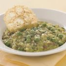 Meanwhile, reserve 1 cup of the peas in a small bowl. In another bowl, combine the remaining peas and 3/4 cup of the cooking water. Using an immersion blender, puree the peas, adding more water if needed. Strain through a fine-mesh sieve into a bowl. Set aside.