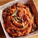 Melted butter seasoned with fresh sage, ground cinnamon, grated nutmeg and brown sugar give a flavor boost to these mashed sweet potatoes. Drizzle with the maple-pecan topping for a sweet crunch.