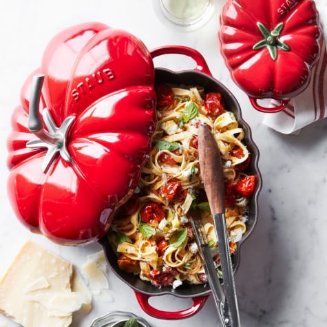 Roasting cherry tomatoes in a hot oven caramelizes them and deepens their sweet flavor. In this easy summer pasta, the juicy tomatoes are tossed with fresh tagliatelle and goat cheese, which melts to form a creamy sauce. Fresh basil and grated Parmesan add the finishing touch.
