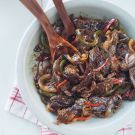 Pat the beef slices dry with paper towels. Warm a wok or large fry pan over high heat, then swirl in 2 Tbs. of the canola oil. Add half of the beef in a single layer and sear until brown on the first side, about 1 minute. Using tongs, turn and sear until brown on the second side, about 30 seconds. Transfer the meat to a colander to drain. Return the pan to high heat, warm another 1 Tbs. of the oil and repeat to sear the remaining beef. Transfer the second batch to the colander to drain.