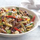 Bell peppers, eggplant and zucchini are all at their best in summer. Here they are simply grilled, then tossed with a vibrant mustard vinaigrette. Blue cheese and walnuts add richness, while chickpeas add protein to this plentiful salad.
