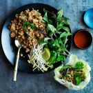 Larb is a beloved Southeast Asian salad that can be made with almost any type of minced meat. Here, we use ground chicken and wrap the savory meat mixture in lettuce leaves for a fresh and light take on this dish. For a casual dinner, place the chicken mixture, lettuce leaves and garnishes on the table and let diners help themselves. For an even easier version of this dish, use one of our Thai lettuce wrap starters.