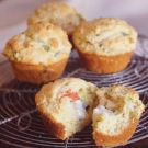 Spoon the batter into the prepared muffin cups, filling each half full. Shape each portion of goat cheese into a round and set it in the center of the muffin batter. Place 1 or 2 tomato chunks on top of the cheese and gently press into the batter. Cover the cheese and tomato with batter until level with the rim of the cup.