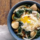 Like Japanese soba noodles, udon noodles are often served chilled in the summer and hot in the winter, and toppings are chosen to reflect the seasons. In this recipe, they are served hot in a mildly flavored broth and are topped with chicken and spinach. Just before serving, an egg is cracked over the noodles and is cooked gently by the hot broth ladled on top. If you prefer, you can poach the eggs individually and carefully transfer them to the bowls.