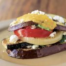 The classic napoleon is layers of puff pastry filled with pastry cream or whipped cream, but nowadays the definition has grown to embrace almost anything, sweet or savory, that is layered. Roasted vegetables, which are pliant and colorful, make a particularly wonderful napoleon. Eggplant, zucchini, onion and tomato are the choices here, and the roasted yellow pepper puree makes an attractive—and easy—sauce. If you like, substitute basil or thyme for the mint.