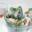 Fold up the bottom of the rice paper round and then fold in the sides. Tightly roll the rice paper around the ingredients, sealing the seam against the roll. Place the roll, seam side down, on a platter. Repeat with the remaining ingredients. Cut each roll in half on the diagonal and serve with the dipping sauce. Serves 4.