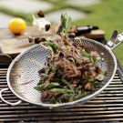 Prepare a medium-hot fire in a grill. Place a steel grill fry pan on the grill, cover the grill and heat until the internal temperature of the grill reaches 600° to 650°F.