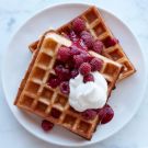 Waffles make any weekend morning special—even more so when they are topped with a bright raspberry sauce and a billow of whipped cream.