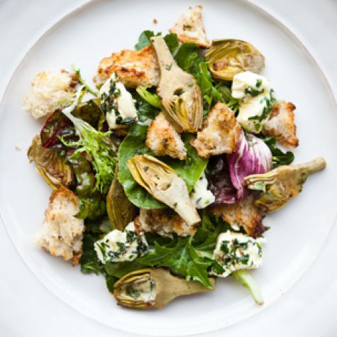 Add the warm artichokes and bread to the bowl with the salad greens, drizzle with the vinaigrette and toss. Season well with salt and pepper. Serve the salad on large individual plates with 3 pieces of cheese around the perimeter of the plate, or on a big platter with the cheese underneath or tossed in. Serves 8.
