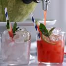 The perfect punch for a summer celebration, this refreshing drink is made from pureed watermelon for the ultimate in fresh flavor. Here we serve it in a keg made from a watermelon, but if you don’t have a watermelon tap kit, simply serve it from a punch bowl or your favorite drink dispenser.