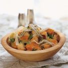 In a nonreactive mixing bowl, combine the fennel, carrot, celery, half of the parsley, the green onions, lemon juice, vinegar, 3 Tbs. olive oil, salt and pepper. Stir together until blended and set aside.