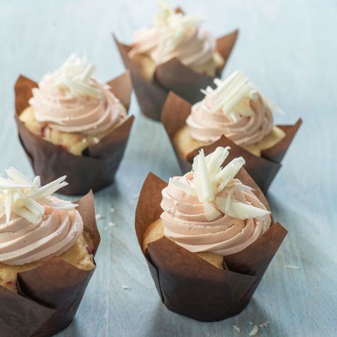 Spoon the buttercream into a pastry bag fitted with a star tip and pipe the buttercream onto the cupcakes. Shave curls from the chunk of white chocolate and sprinkle over the cupcakes. Makes 12 cupcakes.