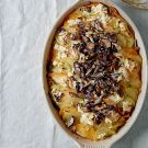 Ryan Burger, the cheese maker at Blackberry Farm, developed this recipe to highlight Brebis, a creamy sheep’s milk cheese he makes on the farm. In its place, you can use goat’s milk cheese or fromage blanc. He loves to forage for mushrooms and combines whatever he can find for this dish, such as the varieties suggested below. Unlike a traditional gratin, this one uses no cream; the cheese provides plenty of richness.