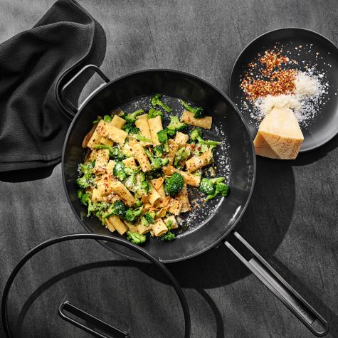 Ideal for a quick weeknight dinner, this comforting pasta dish was developed by cookbook author and actor Stanley Tucci. He says it’s a good example of how the cooking styles of both sides of his family have melded. “The Tucci family prepared this dish with ziti and no garlic,” he explains. “The Tropiano family [his mother’s side] prepared it using spaghetti broken into 2 1/2-inch (6-cm) lengths, so now my mother sometimes serves it with broken spaghetti. Either way, it’s very tasty.” Stanley suggests pouring a light white, light red or rosé wine alongside.