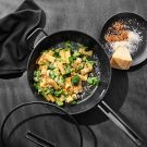 Trim off 2 to 3 inches (5 to 7.5 cm) of the tough broccoli stems and discard. Cut the broccoli florets away from the remaining tender stems. Cut the florets into large bite-size pieces. Peel the tender stems as you would carrots, then cut into short sections and then into thin, bite-size lengths. Set all of the prepared broccoli aside.