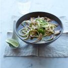 Add the shredded chicken, fish sauce and zucchini noodles to the pot and stir to combine. Serve immediately with your choice of green onions, jalapeño chile, mint leaves and lime wedges alongside. Serves 4.