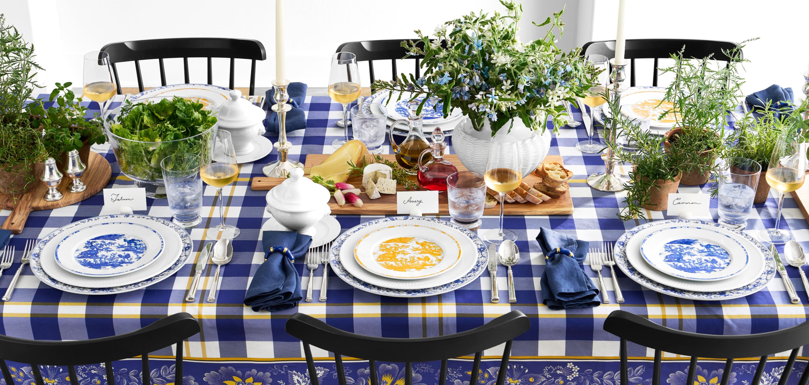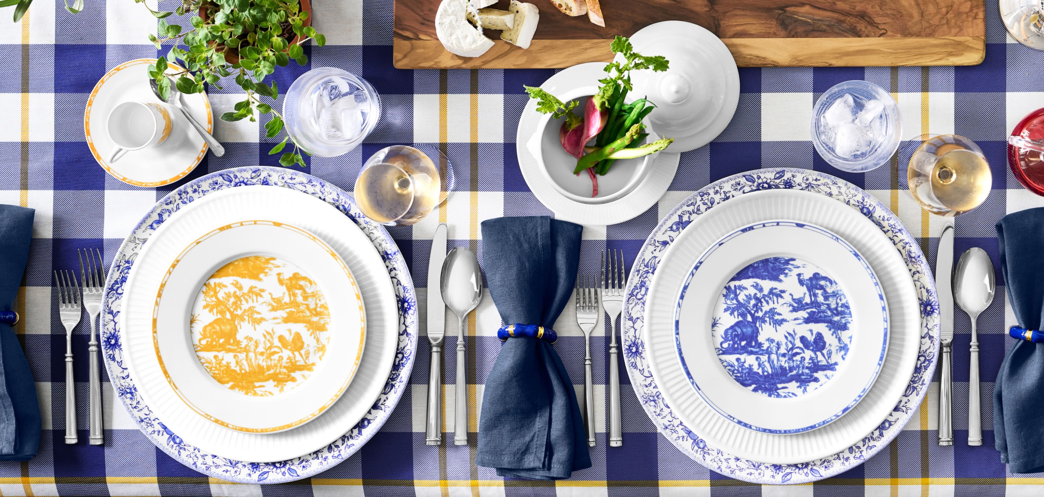 Inspired by archival Toile de Jouy patterns, each piece in this collection features a different scene from the vintage textile. This dinnerware is